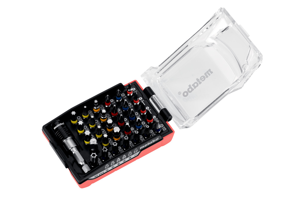 • Bits aus Chrom-Vanadium-Stahl (S2-Qualität); Bits mit Farbcodierung: für ein schnelles und einfaches Auffinden des passenden Bits; Magnetischer Schnellwechseladapter; Mit Adapter für Steckschlüsseleinsätze (Stecknussadapter); Hochwertige, robuste Box im speziellen Metabo-LiHD Akku-Design
