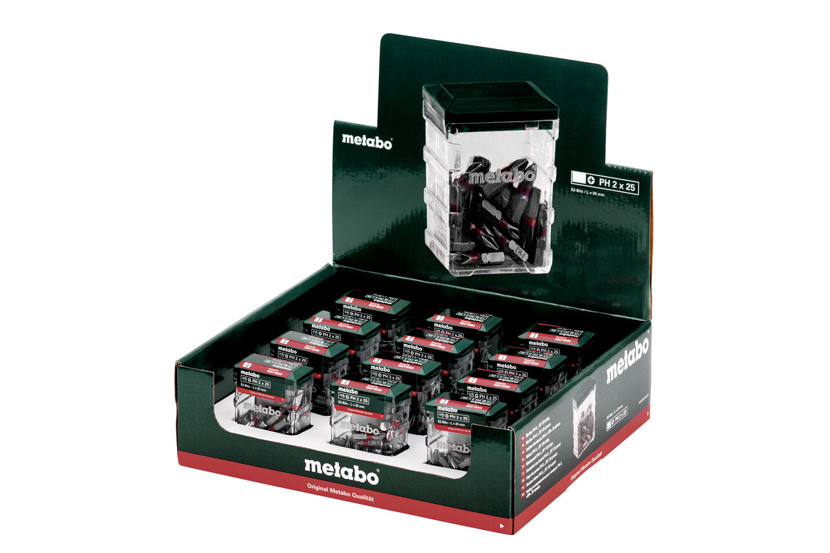• Bits aus Chrom-Vanadium-Stahl (S2-Qualität); Bits mit Farbcodierung; Hochwertige, robuste Box im speziellen Metabo-Design, mit Euroloch-Aufhänger