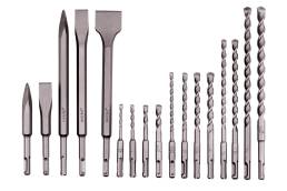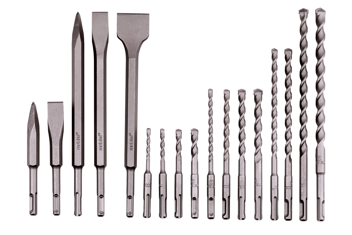 • Bestehend aus: Ø 5, 6, 8, 10 L=110 mm / Ø 6, 8, 10, 12 L=160 mm / Ø 8, 10 L=210mm / Ø 12, 14 L=260mm / Spitzmeißel L=140mm, L=250mm / Flachmeißel 20x140mm, 20x250mm / Breitmeißel 40x250mm
