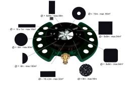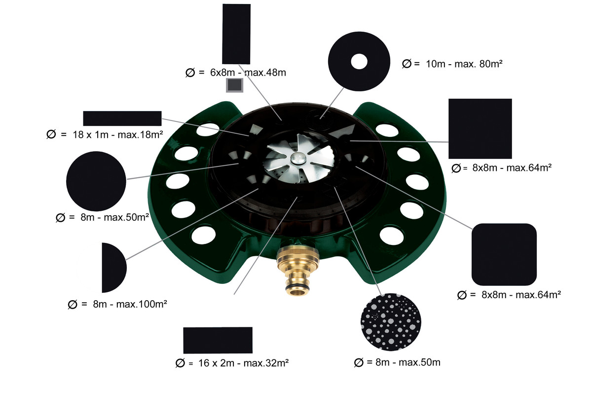 • 9 surfaces d'arrosage, allant du cercle ou du rectangle au brouillard diffus