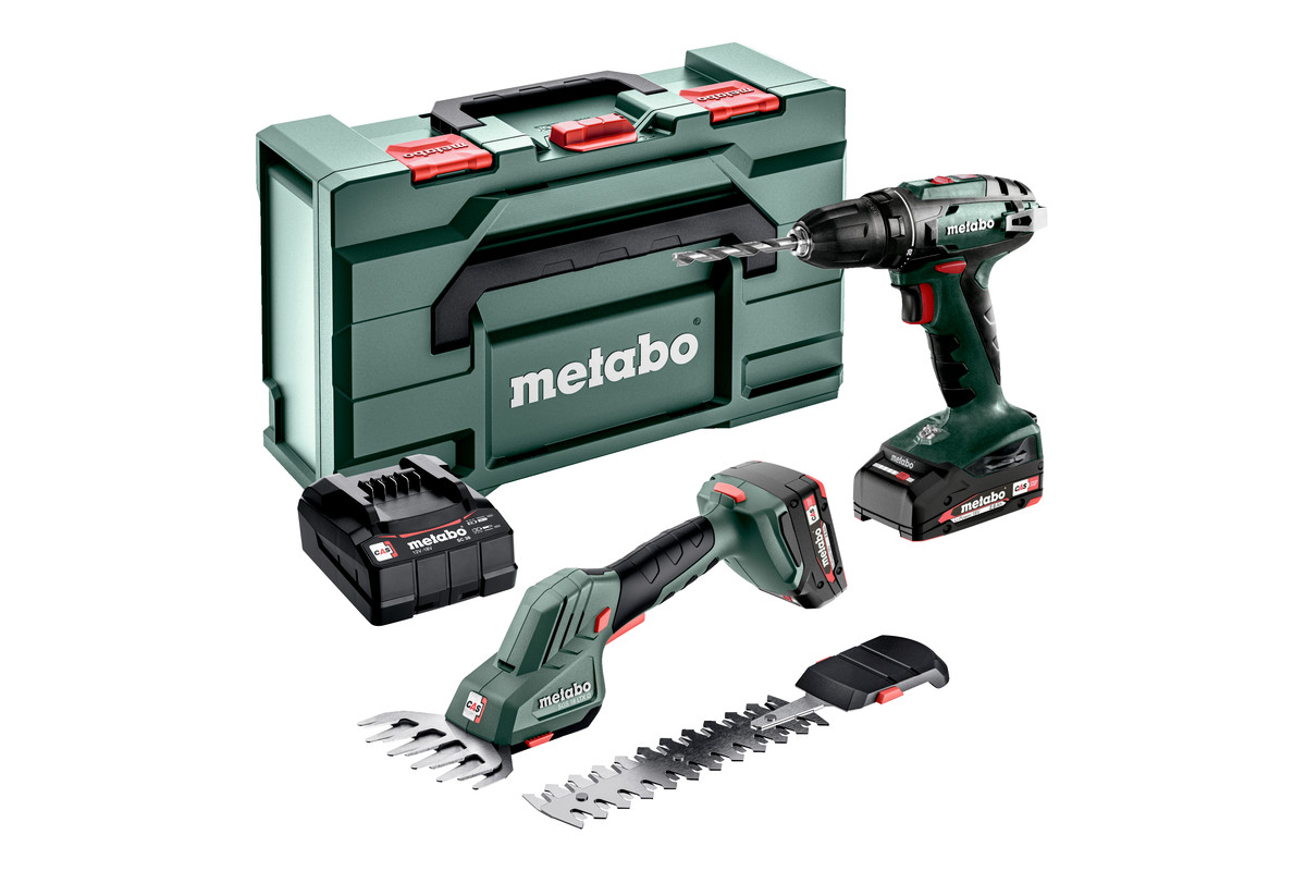 • Perceuse-visseuse sans fil BS 18, sculpte-haie et cisaille à gazon sans fil SGS 18 LTX Q, 2 batteries LiPOWER (18 V/2,0 Ah), chargeur SC 36, metaBOX 165 L, lame pour gazon 11,5 cm, lame pour haie 20 cm