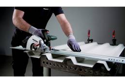 - Découpes parfaitement droites de grilles métalliques, de tôles d'acier et de tôles profilées grâce au rail de guidage (accessoire)